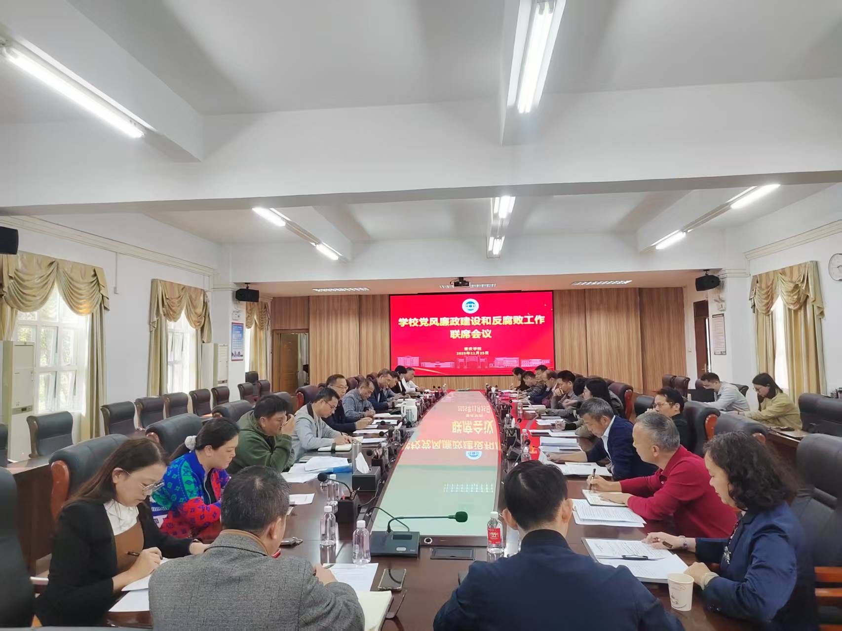 11月25日,2025年学校党风廉政建设和反腐败工作联席会议在临峰厅召开。会议认真学习习近平总书记关于全面从严治党的重要论述,分析学校全面从严治党工作面临的形势和任务,并对下一阶段工作作出部署。校纪委书记、监察专员王克俭主持会议。学校纪委委员、联席会议成员单位相关负责人和纪检监察室全体工作人员参加了会议。