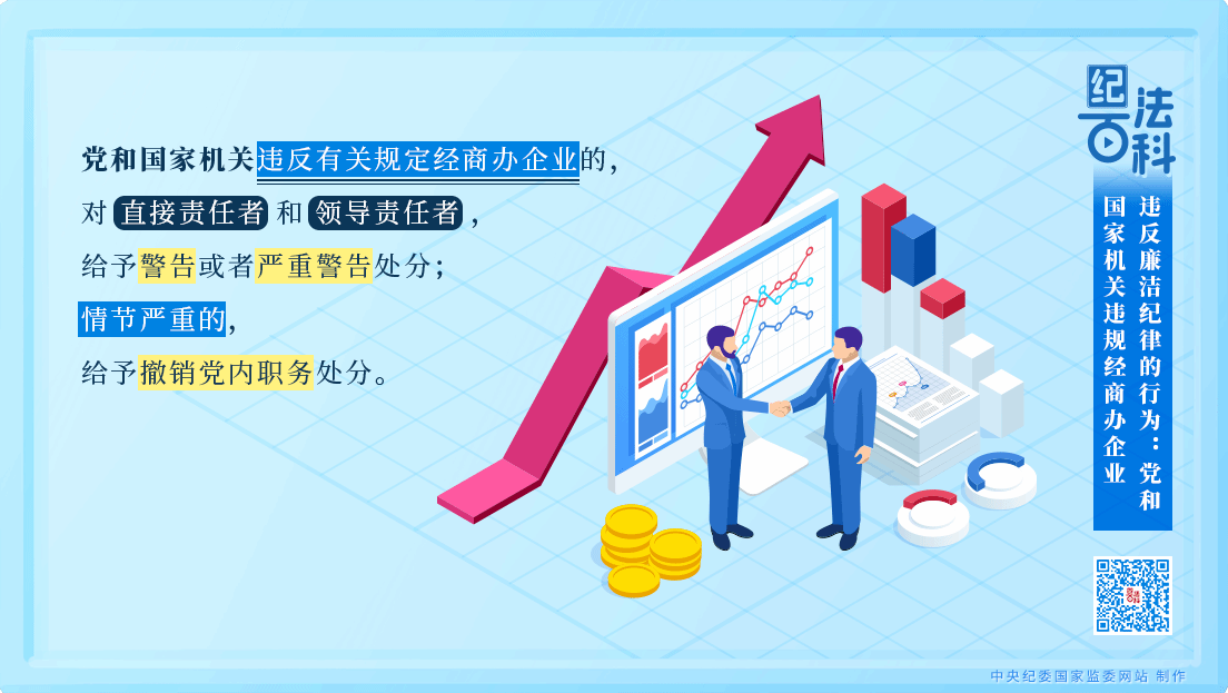 《中国共产党纪律处分条例》第一百零八条规定,党和国家机关违反有关规定经商办企业的,对直接责任者和领导责任者,给予警告或者严重警告处分;情节严重的,给予撤销党内职务处分。