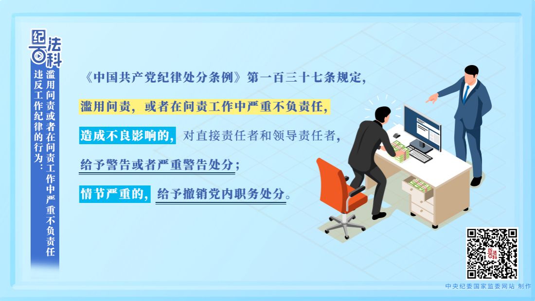 《中国共产党纪律处分条例》第一百三十七条规定,滥用问责,或者在问责工作中严重不负责任,造成不良影响的,对直接责任者和领导责任者,给予警告或者严重警告处分;情节严重的,给予撤销党内职务处分。