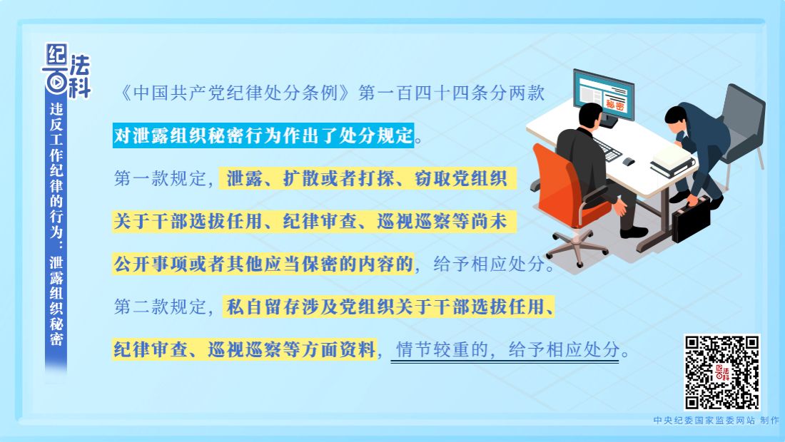 “严守党的纪律,保守党的秘密”,是每名党员入党宣誓时的郑重承诺。无论选人用人工作、纪律审查工作,还是巡视巡察等工作,都有严格的保密纪律。《党政领导干部选拔任用工作条例》规定,选拔任用党政领导干部,不准私自泄露研判、动议、民主推荐、民主测评、考察、酝酿、讨论决定干部等有关情况。《中国共产党纪律检查机关监督执纪工作规则》规定,监督执纪人员不准私自留存问题线索和涉案资料,严禁泄露审查调查工作情况,对纪检干部私存线索、跑风漏气、违反安全保密规定等违纪行为要严肃处理。《中国共产党巡视工作条例》规定,巡视工作人员私自留存巡视工作资料,泄露与巡视工作有关的未公开信息的,要给予处理处分。